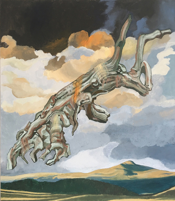 Related to the anthropomorphic works, are Hrbacek’s “Tree Woman in the Wind”, 2022, and its counterpart “Ascension”, 2022, paintings that speak directly to the exhibition’s theme “Vanishing” because they depict a rootless yet solid tree and an incorporeal tree respectively against blue/gray skies. The two works seen together formulate a tableau that offsets the solid vs void, or the substantial against the numinous. The significance of these images doesn’t necessarily need to be attributed to spirituality vs materialism, and it would not be a stretch to see them in terms of climate precarity and exploitation.Hrbacek’s “Single Searching”, “Twisted 2 Naxos”, and “Street Smart”, all from 2020, evince trees growing in constricted architectonic places. In their struggle for life, the tree entities adapt to the angles of walls, floors, girders, columns and other architectural confinements. They are forced to twist and turn, curve and bend, align and otherwise alter their natural proclivities in order to survive. Hrbaceck’s trees may be struggling but they’ve found a way to stay alive by adapting to their context and this message is of restorative value to humanity. With a similar goal but with different visual forms Marina Abramovic and Alejandro Duran for Healing: “Life in Balance”, at the Weltkulturen Museum in Frankfurt, tried to restore nature’s balance by collecting hundreds of plastic waste products from Mexico’s coast.